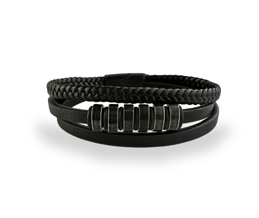 Конструкция браслета состоит из трёх кожаных ремешков, которые искусно сплетены в единый элемент, создавая динамичный дизайн. Эта многослойность добавляет изделию визуальный объём и делает его особенно притягательным. Геометрия и металлический блеск вставок привносят в дизайн ноты мужественности и решительности.