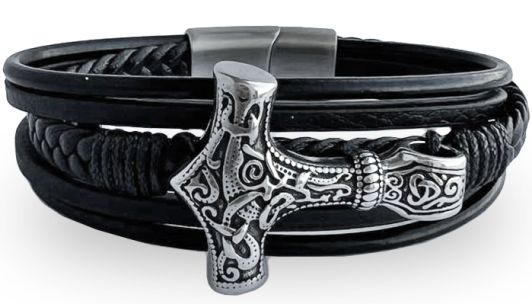 Центральное место в дизайне браслета занимает элемент в виде Молота Тора, выполненный из нержавеющей стали с узорной гравировкой. Этот символ, вдохновлённый скандинавской мифологией, несёт в себе глубокую символику силы и защиты, что делает браслет не только модным аксессуаром, но и мощным талисманом для своего владельца.