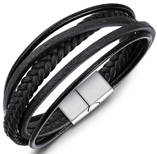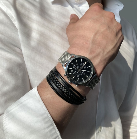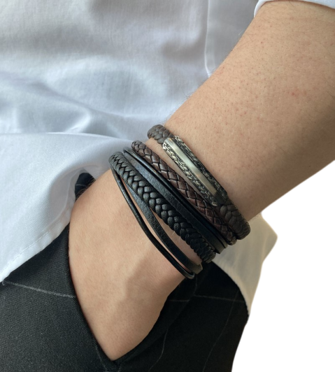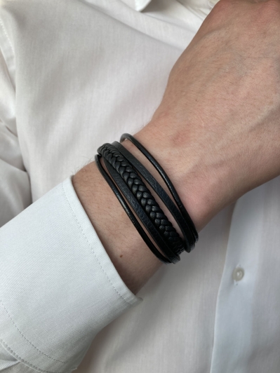 Браслет состоит из нескольких кожаных ремешков, которые искусно переплетаются между собой. Этот многослойный дизайн придаёт изделию дополнительную визуальную глубину и динамичность, создавая впечатление лёгкости и воздушности, не лишая его при этом статуса солидного мужского аксессуара.
