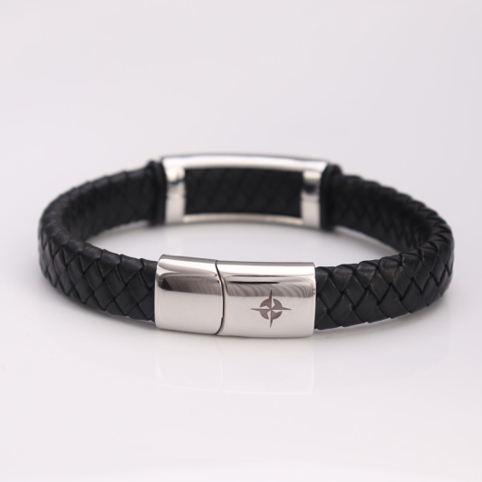 Центральным элементом браслета является плетеный ремешок из натуральной кожи черного цвета. Плетение добавляет текстуру, объем и визуальный интерес, подчеркивая мужественность и уверенность. Черный цвет кожи придает браслету строгость и универсальность, позволяя сочетать его с различными стилями одежды.