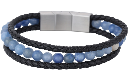 - состоит из трех браслетов: два черных плетеных ремешка из кожи, бусины синего цвета из натурального камня с эффектом "тигровый глаз";