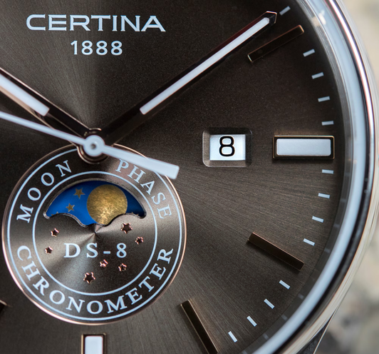 Указатель фазы Луны – одно из классических усложнений в часовом искусстве – выглядит в этой модели особенно современно и минималистично. Фазы луны отображаются на вращающемся диске в окошке циферблата. Механизм часов оснащен кварцевым калибром Precidrive, что дает погрешность всего +\- 10 секунд в год – это в 8–10 раз точнее обычных кварцевых часов.