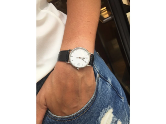 - лаконичные метки и стрелки, белый матовый циферблат;
