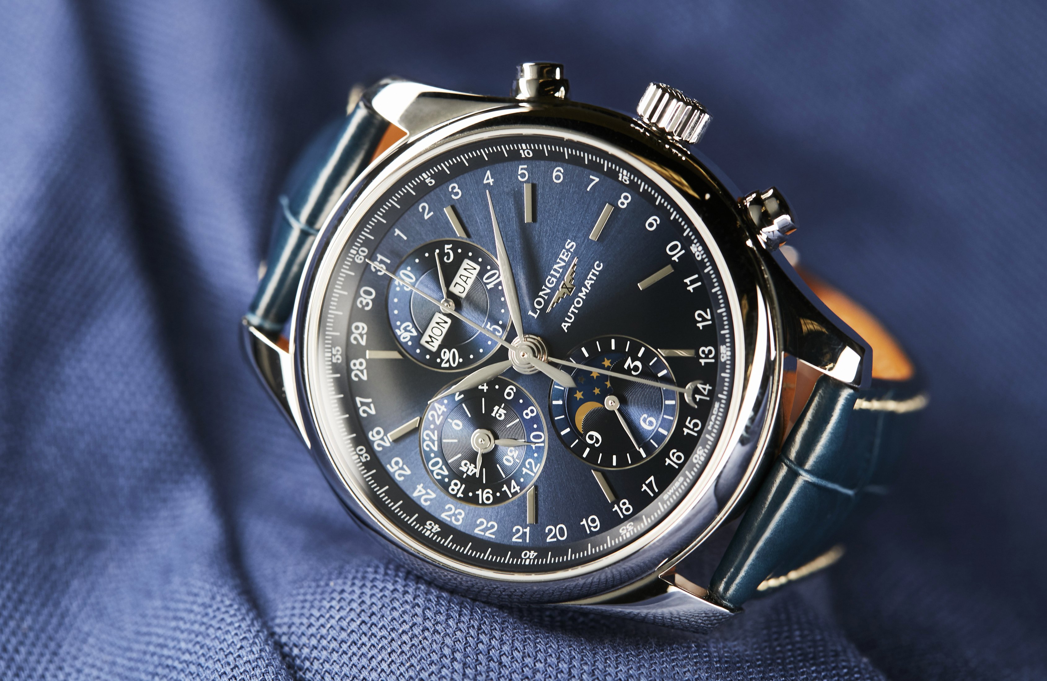 - циферблат глубокого синего цвета с радиальной шлифовкой в стиле “sunrays”, дополнительные индикаторы с гильошированием в виде концентрических кругов;