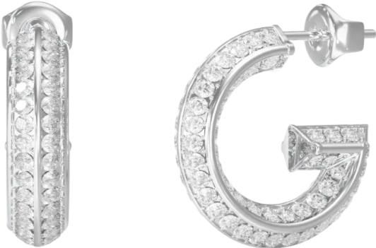 Главная особенность этих сережек – их уникальная форма. Они выполнены в виде стилизованных букв «G» – узнаваемого символа бренда Guess. Поверхность сережек инкрустирована множеством сверкающих кристаллов. Мелкие прозрачные камни искусно расположены по контуру буквы, создавая эффект блеска при каждом движении и попадании света.