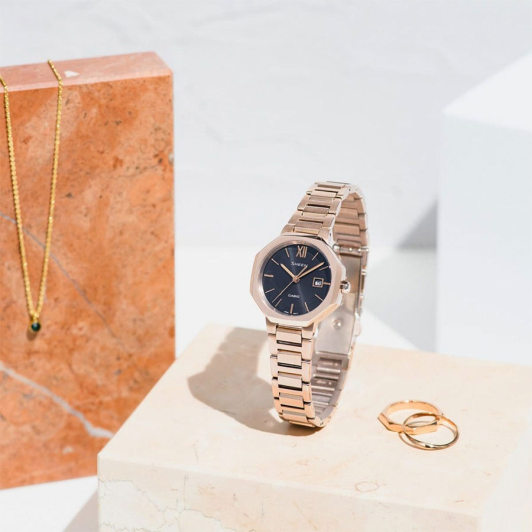 - циферблат с метками в виде штрихов и римской цифры защищен прочным сапфировым стеклом;